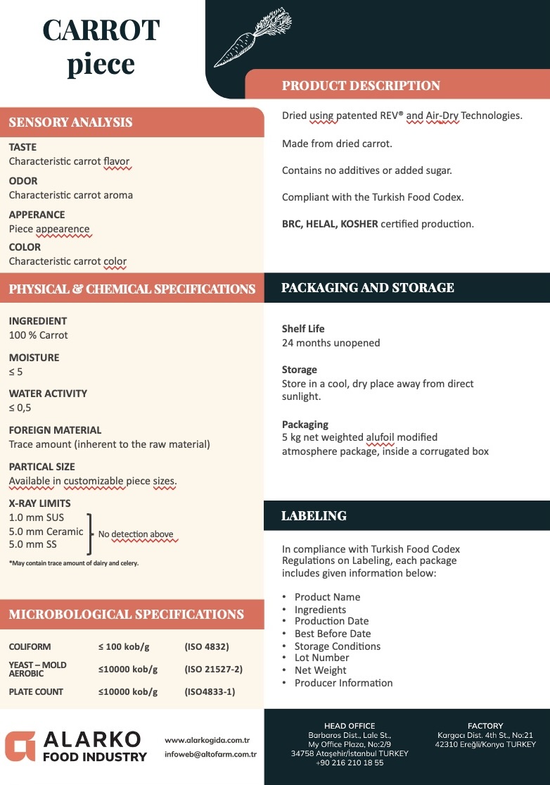 At Alarko Food Industry, we provide advanced dehydration solutions for 11 types of fruits, 23 types of vegetables, and various other products such as cheese, offering them in a wide range of forms and sizes. These high-quality, healthy, and natural products are presented to both the food industry and end consumers.
